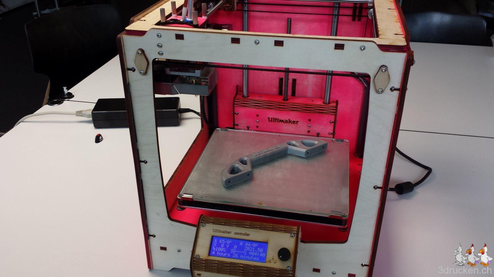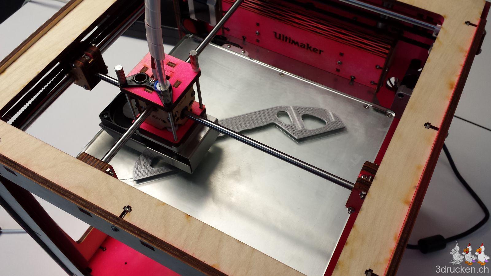 Am zweiten Kurstag, den wir am 16.3. durchgeführt haben, wurde dann auch der zweite Ultimaker Original+ fertig zusammen gebaut, und auf dem ersten montierten Gerät einige Zusatzobjekte, wie der praktische Tragegriff gedruckt.