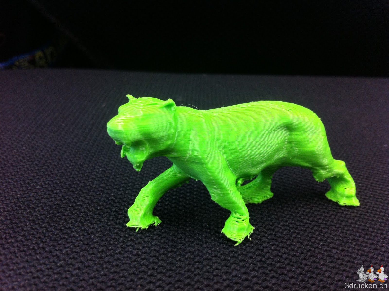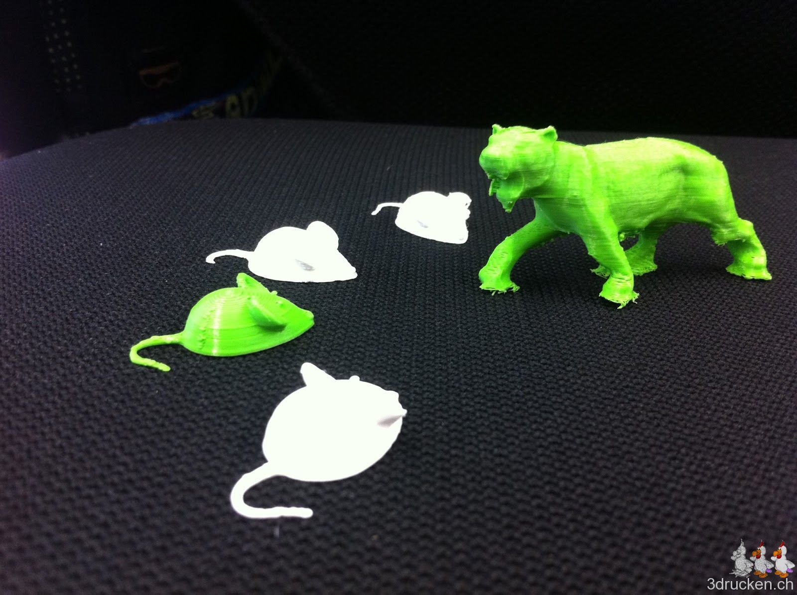 Im Verlauf von Heute wurden weitere Mäuse und ein Tiger ausgedruckt. Beim Tiger druckten wir mit vollem Support. Die Stütze-Stellen vom Support sind gut zu erkennen. Sie stören allerdings nicht gewaltig, da sie sich am Unterkörper des Tieres befinden…