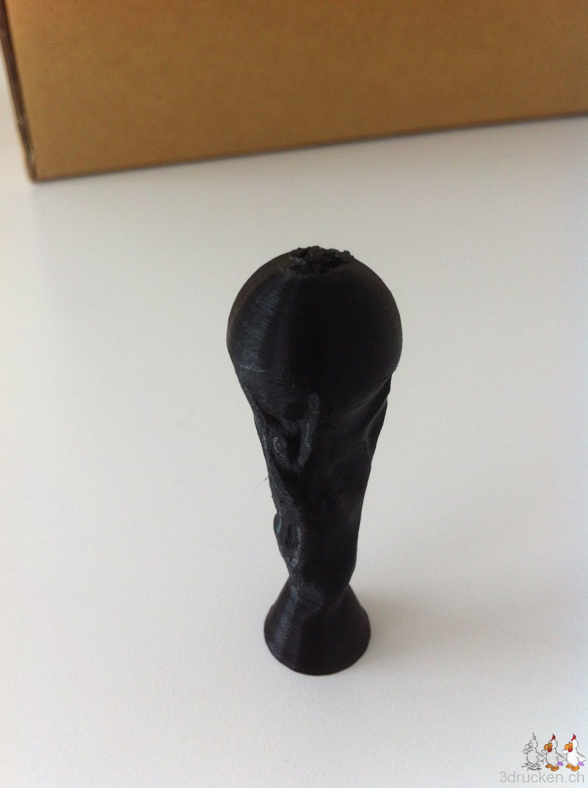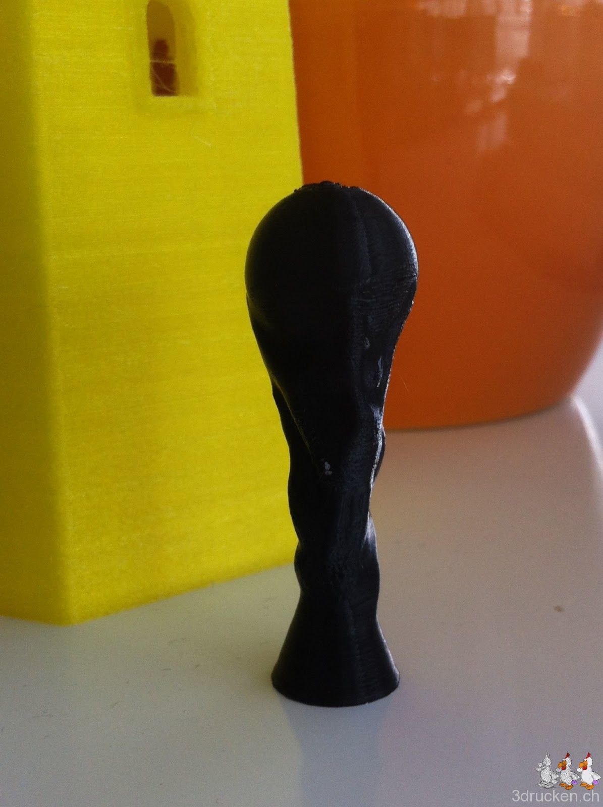 Heute Mittag druckten wir noch den Fussball Weltmeisterschafts-Pokal mit 0.1 mm-Layer aus. Es wurde ein schöner Druck. Dank den 0.1 mm-Schichten kann man auch die Details erkennen.