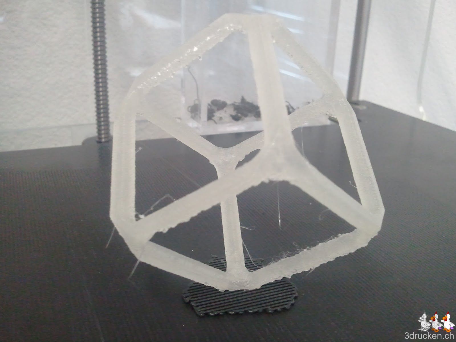 Um chylld’s derafter zu Testen, habe ich das Modell des Würfels im .stl-Format erst in ein .bfb umgewandelt, und dieses dann im derafter geöffnet. Raft entfernt, und ein paar andere Parameter angepasst. Leider haftet das PLA an der Druckplatte wohl nicht bei 195 Grad C, also habe ich das File wieder mit Raft gedruckt.