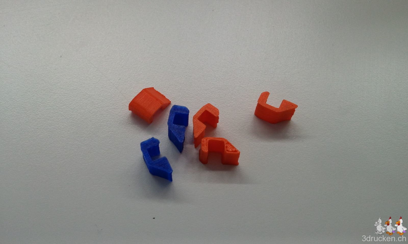 Der dritte Schritt in der Ultimaker-Anleitung ist die Montage der X-Y Achsen (Seite 30ff). Da wir bei unserem ersten Ultimaker dafür die Schliessblöcke mit den Riemenspannern versehen haben, drucken wir nun für den zweiten Ultimaker diese Spanner gleich parallel zur Montage, damit wir anstelle der Schrauben in der Anleitung gleich die neu gedruckten Teile einsetzen können. Wir verwenden allerdings nur die dünnsten, um die Riemen nicht unnötig stark zu spannen. Falls die Riemen später aber lockerer werden, ist es so einfacher die grösseren Spanner einzusetzen, als den Original-Mechanismus zu Entfernen.