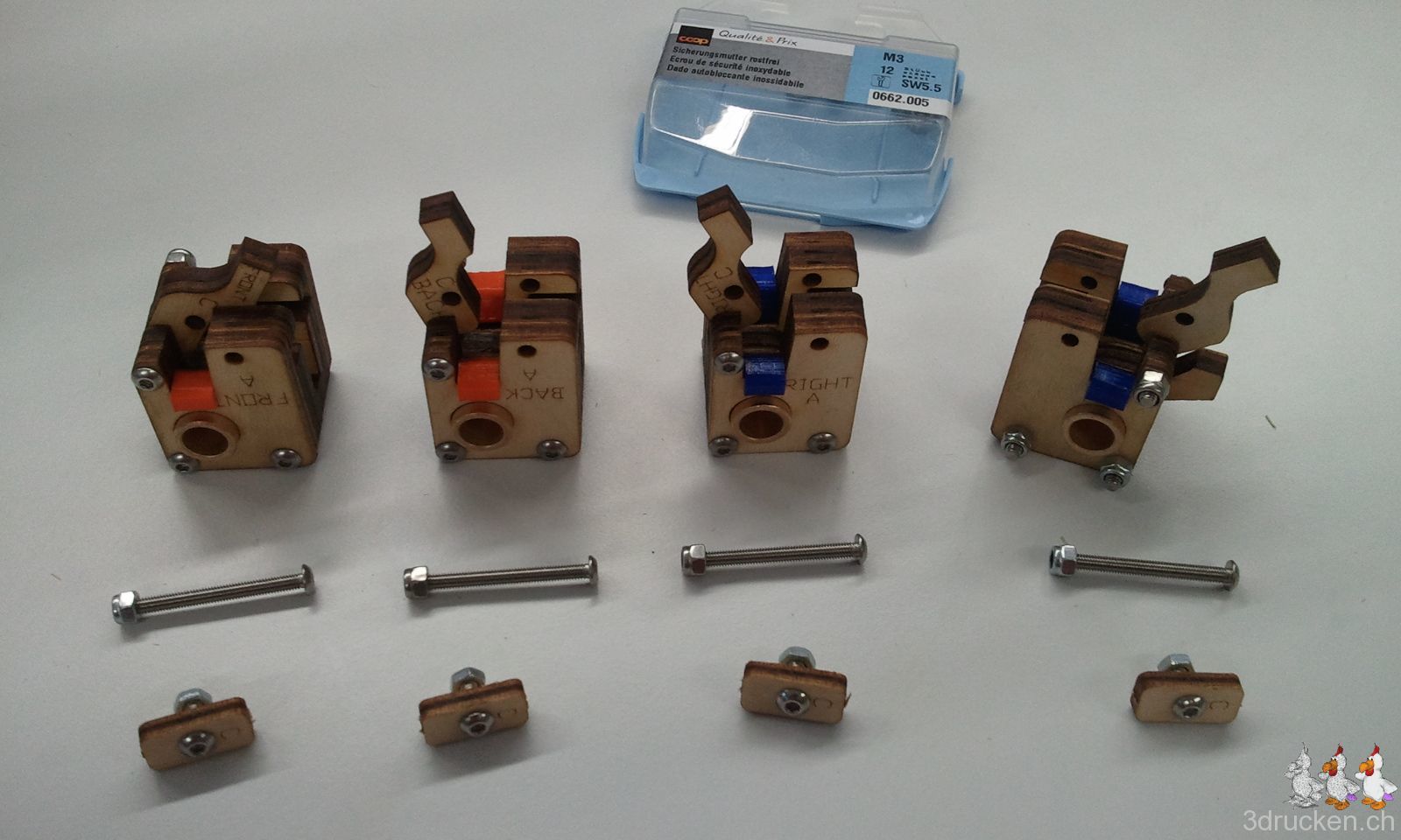 Hier die vier fertig zusammengesetzten Schliessblöcke mit den Riemenspannern, dafür die kurze Schraube mit Mutter in den Hebeln weggelassen, bei den langen Schrauben haben wir Sicherungsmuttern aus dem Baumarkt anstelle von normalen Muttern verwendet. In das vierte Loch jedes Blocks kommt nach dem Anbringen dann noch je eine lange Schraube mit Sicherungsmutter rein, damit der Block genügend stabil zusammen hält.