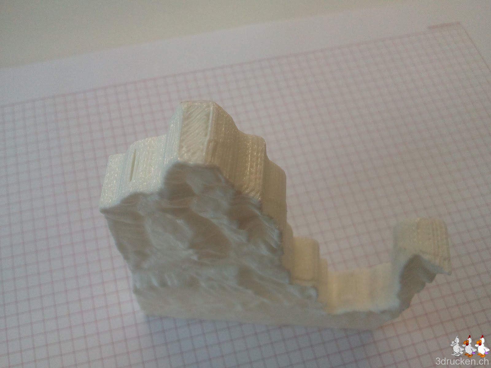Axon 2: PLA Raft und Modell bei 230° C stehend gedruckt. 0.25 mm Schichten, Vase (0 % Füllung, 0 extra skins, 4 surfaces). Gedruckt in 1 h 30 min. Mit 4 surfaces funktioniert es nun. Leider unterscheiden sind die Bereiche mit den zusätzlichen Schichten sichtbar vom Rest des Modells.