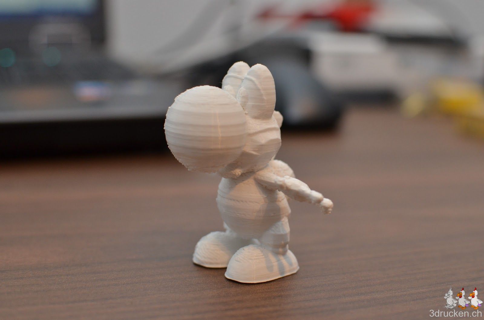 Wir haben uns mit dem zuletzt gedruckten Yoshi aus 123D Creature nicht zufrieden gegeben, und in der 3D-Galerie einen weiteren Yoshi gefunden. Diesen dann durch die Netfabb Cloud gejagt und was zurück kam in Cura 13.01 mit 0.2 mm Schichten geslicet und mit Support in 2 h 4 min gedruckt.