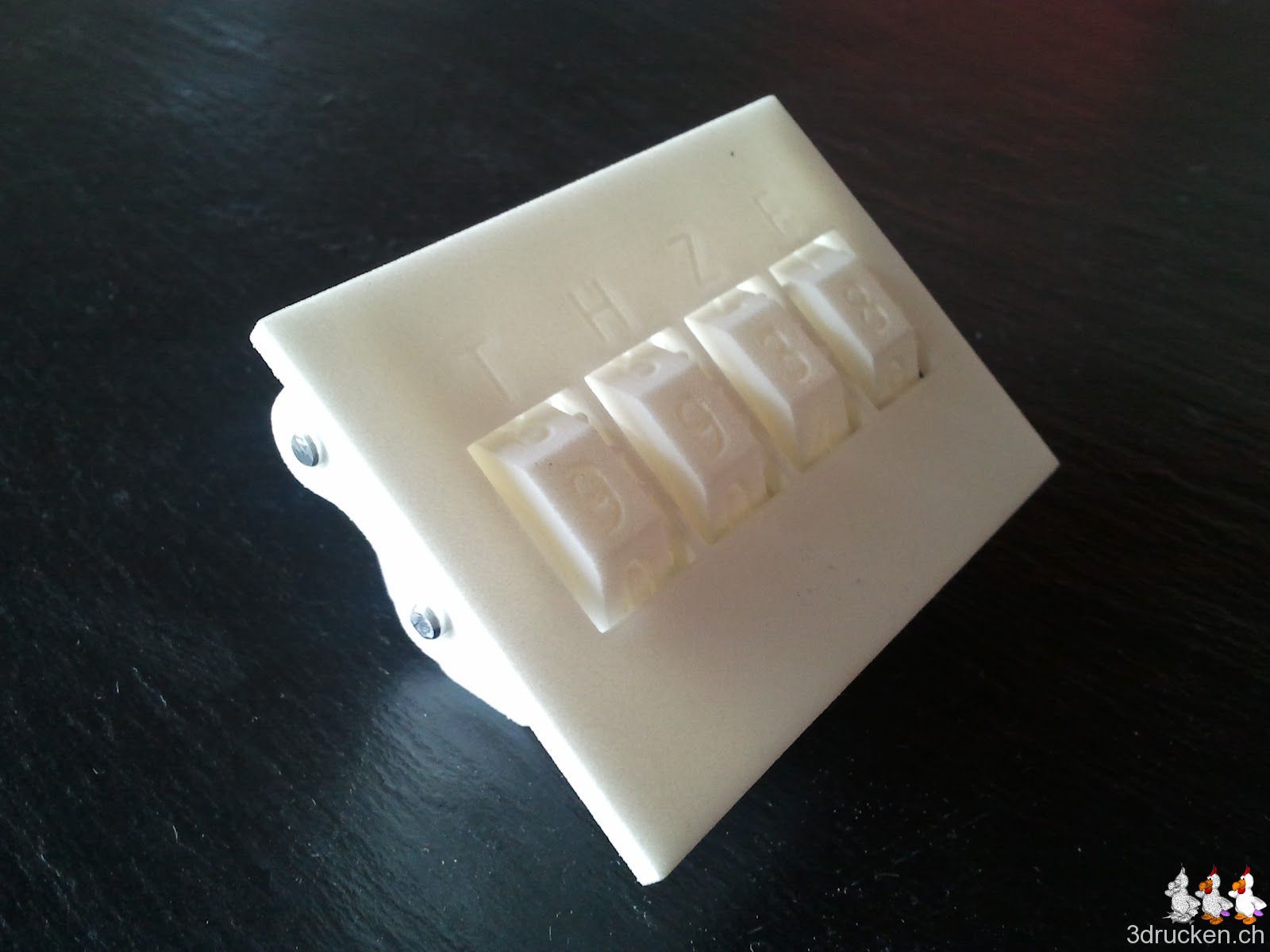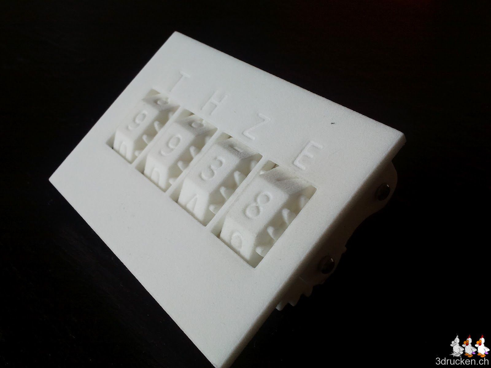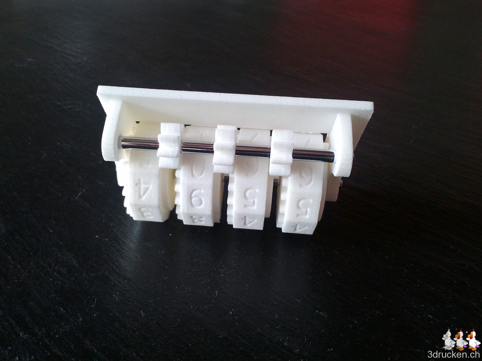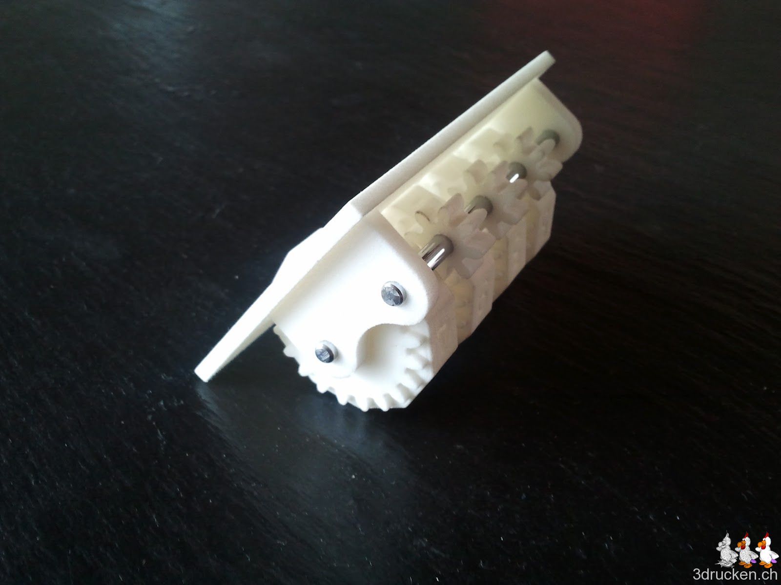 Damit die Kosten nicht noch höher ausfallen, haben wir das billigste Druckmaterial gewählt. Die Teile haben eine raue Oberfläche, welche etwas porös erscheint und Schmutzpartikeln eine prima Haftgrundlage verleiht. Wer also mit Schmutzfingern hantiert, hat bald ein graues Modell. Bei der Konstruktion gingen wir bereits davon aus, dass die 4mm Bohrung bei Zahl- und Zahnrad nicht sehr masshaltig sein werde. Anstatt Durchmesser 4.0mm war diese effektiv 3.8mm. Wir bohrten den Durchmesser auf 4.2 mm auf und hatten damit eine gute Haftung, bzw. Spiel zwischen Rad und Achse.