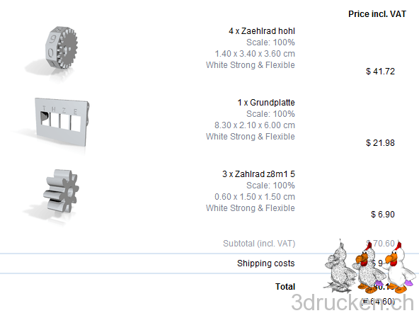 Nachdem wir den Zähler fertig modelliert und für’s Drucken freigegeben hatten, luden wir die Daten auch nach Shapeways hoch. Das Zaehlrad musste aber noch überarbeitet werden, da die Produktionskosten zu hoch wurden (Shapeways berechnet den Preis über das Körpervolumen). Wir entschieden uns also für ein hohles Design mit einer Wandstärke von 2 mm. Danach brauchte es „nur“ noch eine Öffnung, aus welcher nach dem Druckprozess das Pulver heraus geschüttelt werden konnte. So konnte der Preis für ein Zaehlrad von ca. 16 auf 8.28 € reduziert werden.
