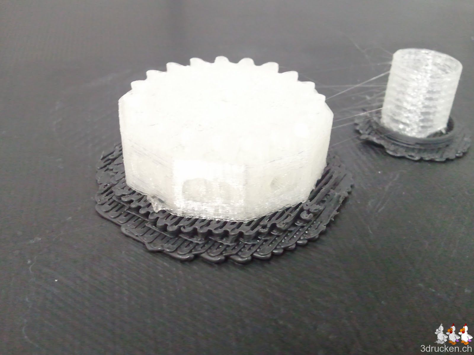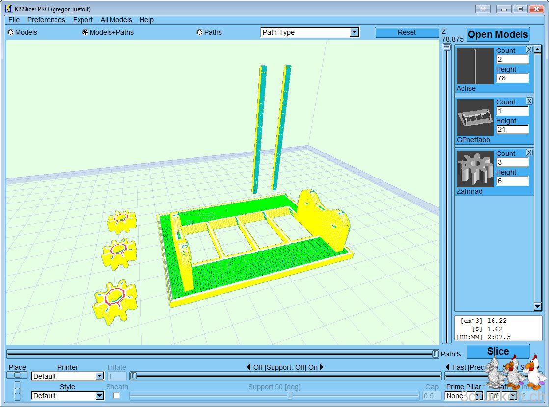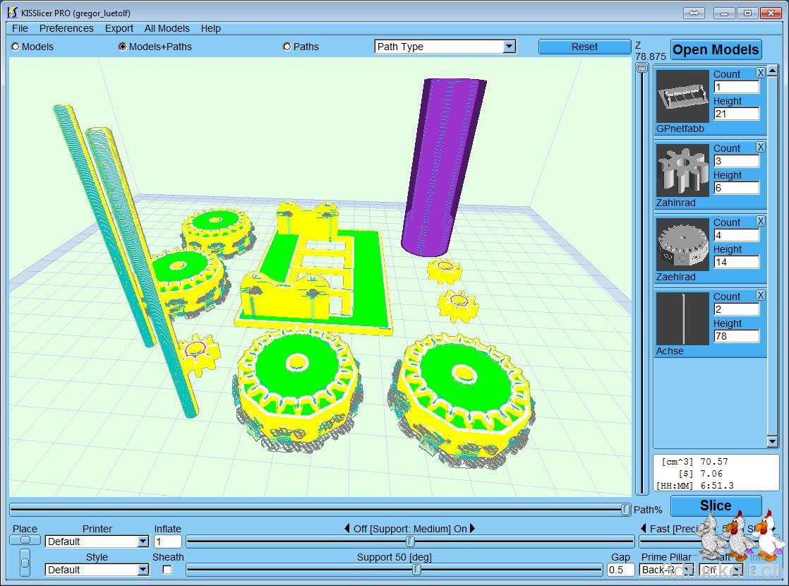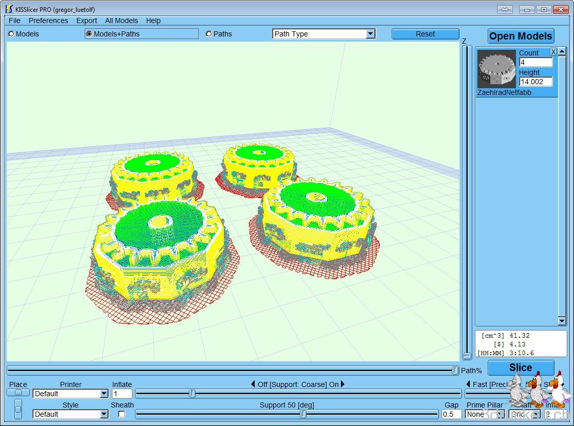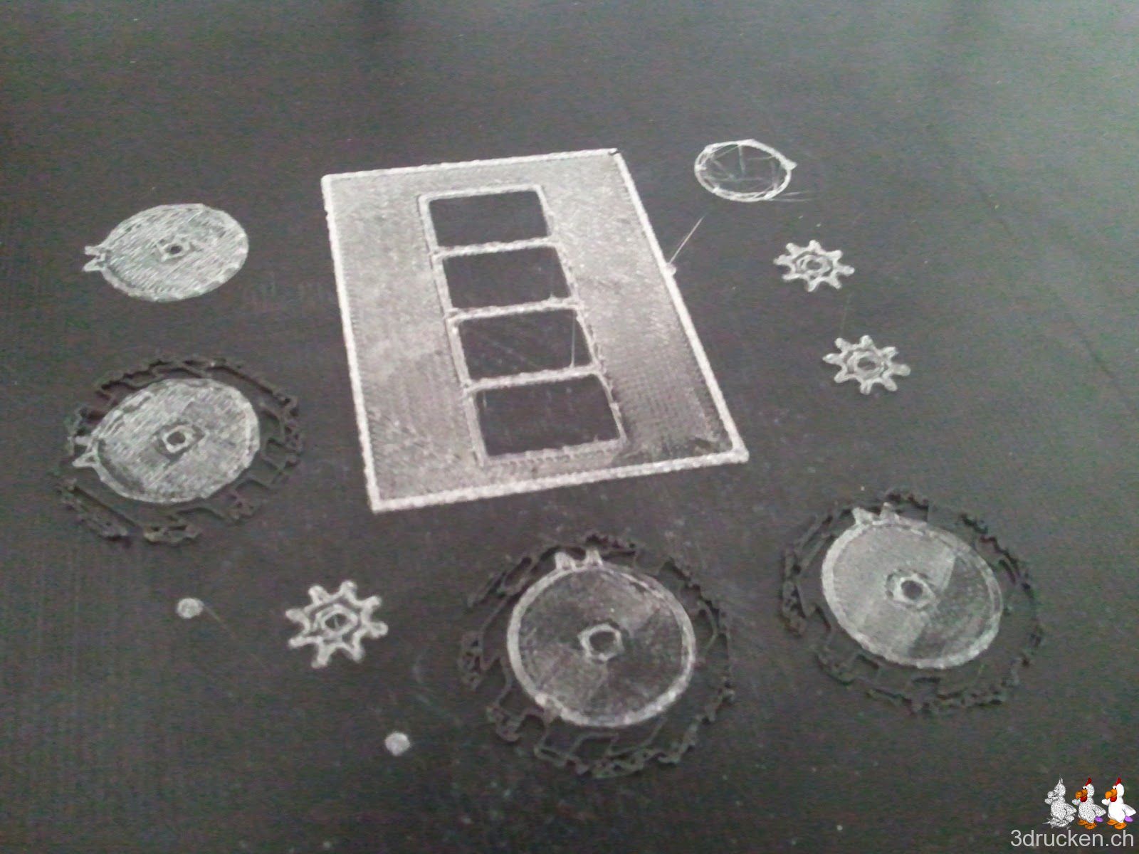 Den erster Druckversuch mit allen Elementen gleichzeitig habe ich nach 30 min gerade abgebrochen, denn der ABS-Support haftet nicht genügend am Tisch ohne ein Raft darunter. Neuer Plan: 2 Druckaufträge, der Erste für die Elemente welche Support benötigen, dh, für die 4 Zahlräder, und den zweiten Druckauftrag für den Rest (3x Zahnrad, 1x Grundplatte, 2x Achsen).