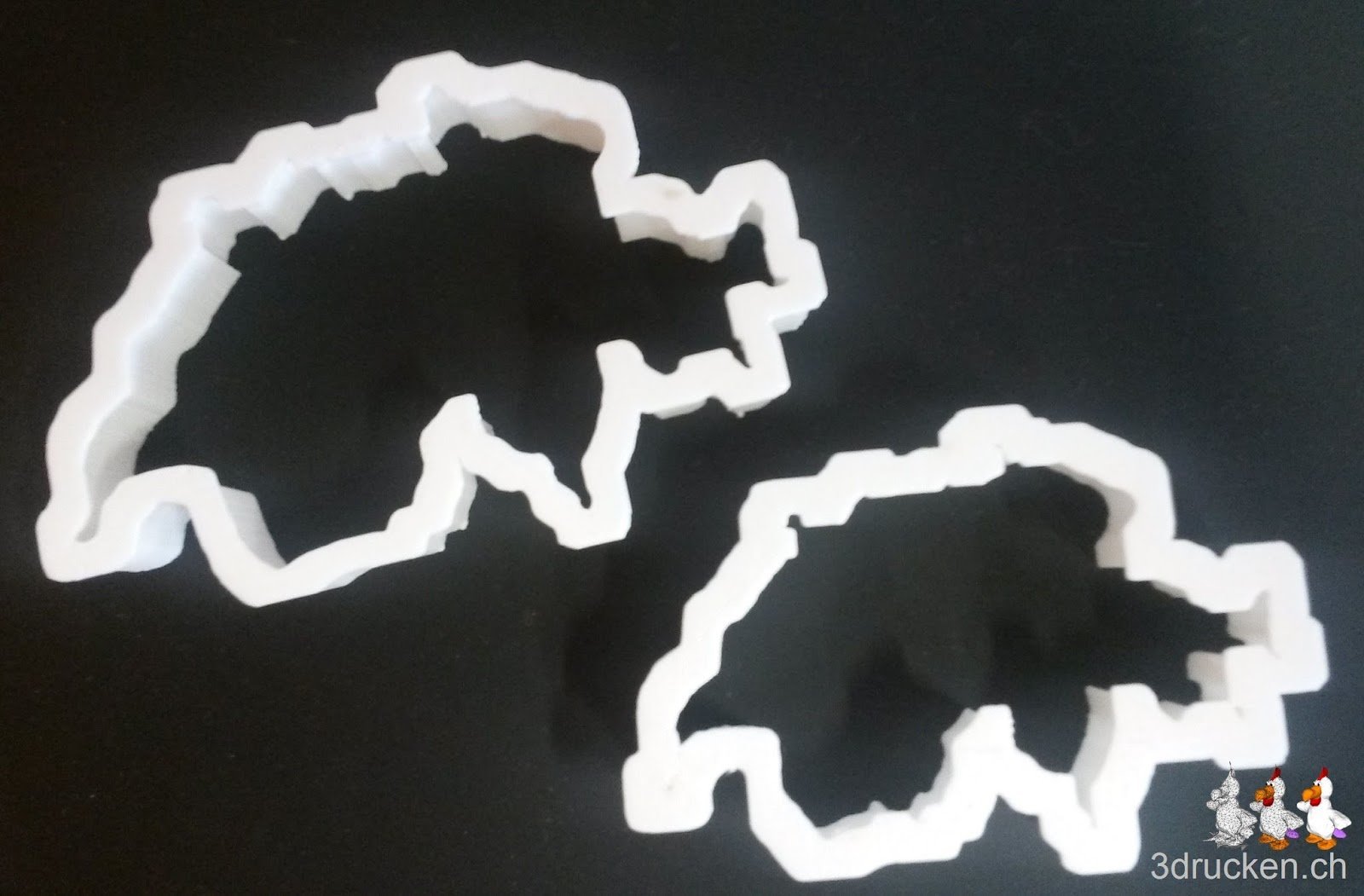 Wie schon mehrmals erprobt, stellten wir im Photoshop ein schwarz-weiss Negativ der Umrisse der Schweiz her und liessen dieses im CookieCaster mit dem Magic Pen in ein Keksförmchen umwandeln. Einmal verwendeten wir die Medium Size und einmal wählten wir Large als Grösse an. Die Höhe setzen wir jeweils manuell in Cura aud 20mm, was sich bisher jeweils bewährt hat.