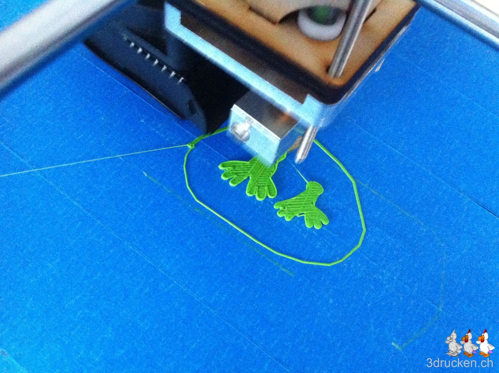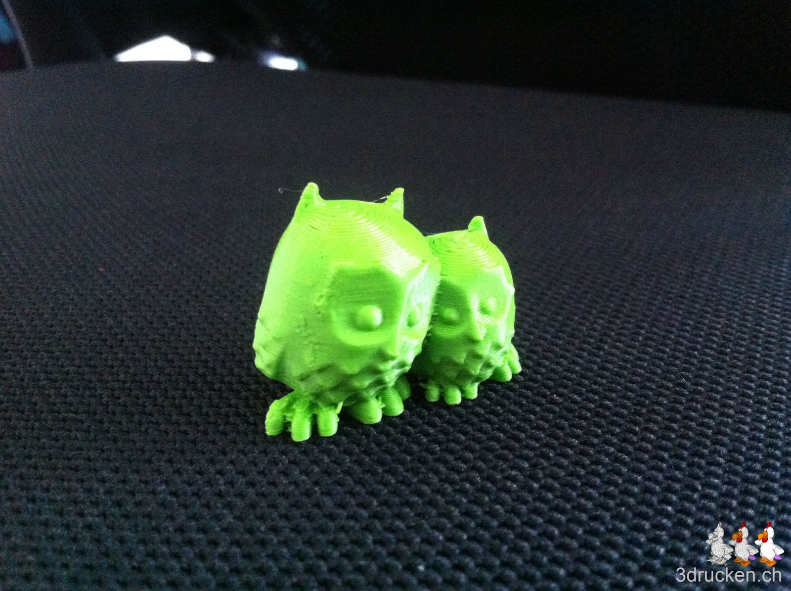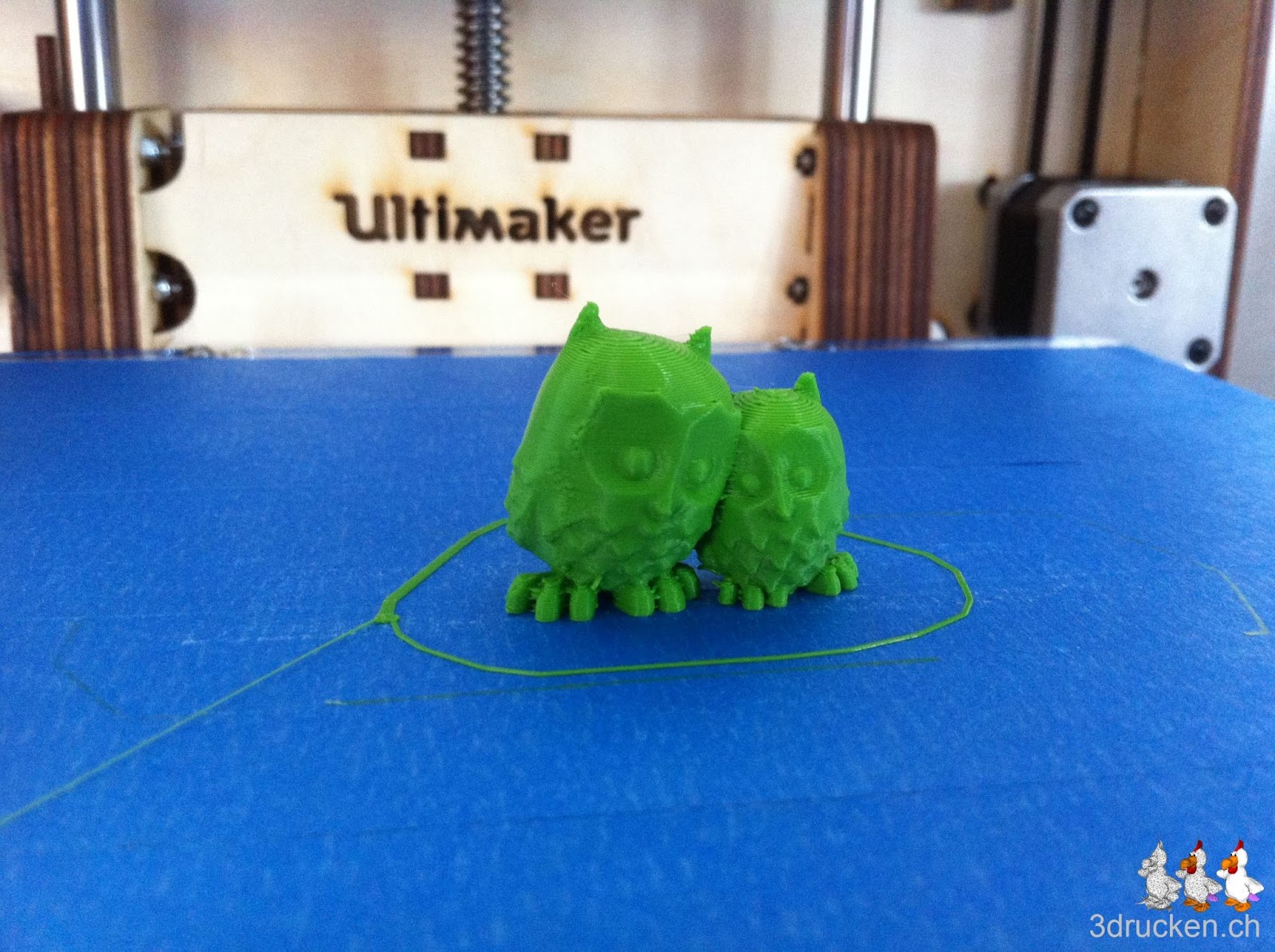 Heute druckten wir eine Erweiterung für unseren Zoo. Als Druckobjekt wählten wir zwei Eulen von Thingiverse. Das Ganze wurde mit Cura 13.03 geslicet. Mit 0.2 mm Schichten, 210° C Drucktemperatur und 20 % Füllung. Der Ultimaker arbeitete auch mit 0.2 mm Layer recht genau.