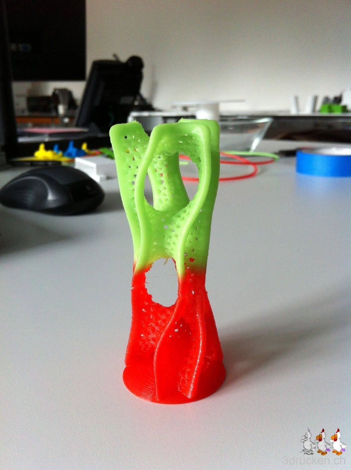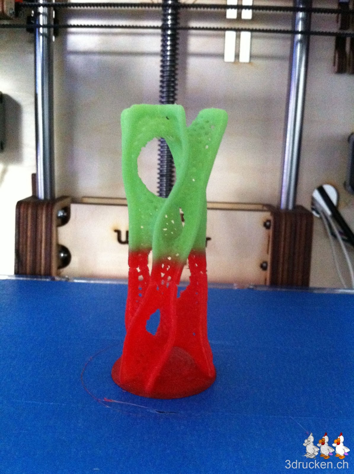 Wir druckten ein Objekt von Dizingof aus, das wir noch lokal gespeichert haben. Das an sich wäre nichts ungewöhnliches, wir versuchten aber in zwei Farben zu drucken. Wie wir das Ganze veranlasst haben, ist hier schon beschrieben.