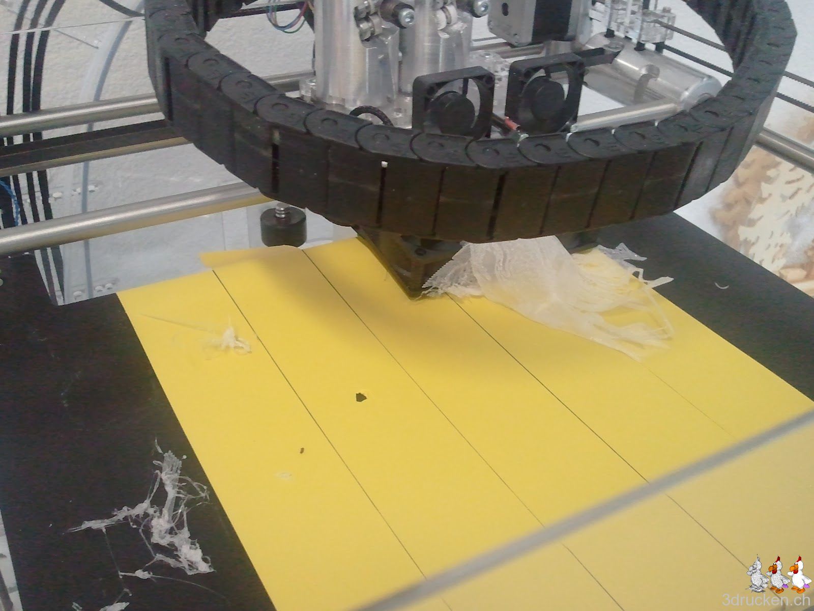Gemeint wir seien schlau, in KISSlicer 0.25 mm eingestellt, das gelbe Klebeband auf den Tisch montiert, den Tisch nach Z neu ausgerichtet. Das PLA haftete wohl am Klebeband zu wenig und hat sich schon während dem Druck gelöst. Ergebnis: erneutes Chaos (Insider nennen es Titanic2).